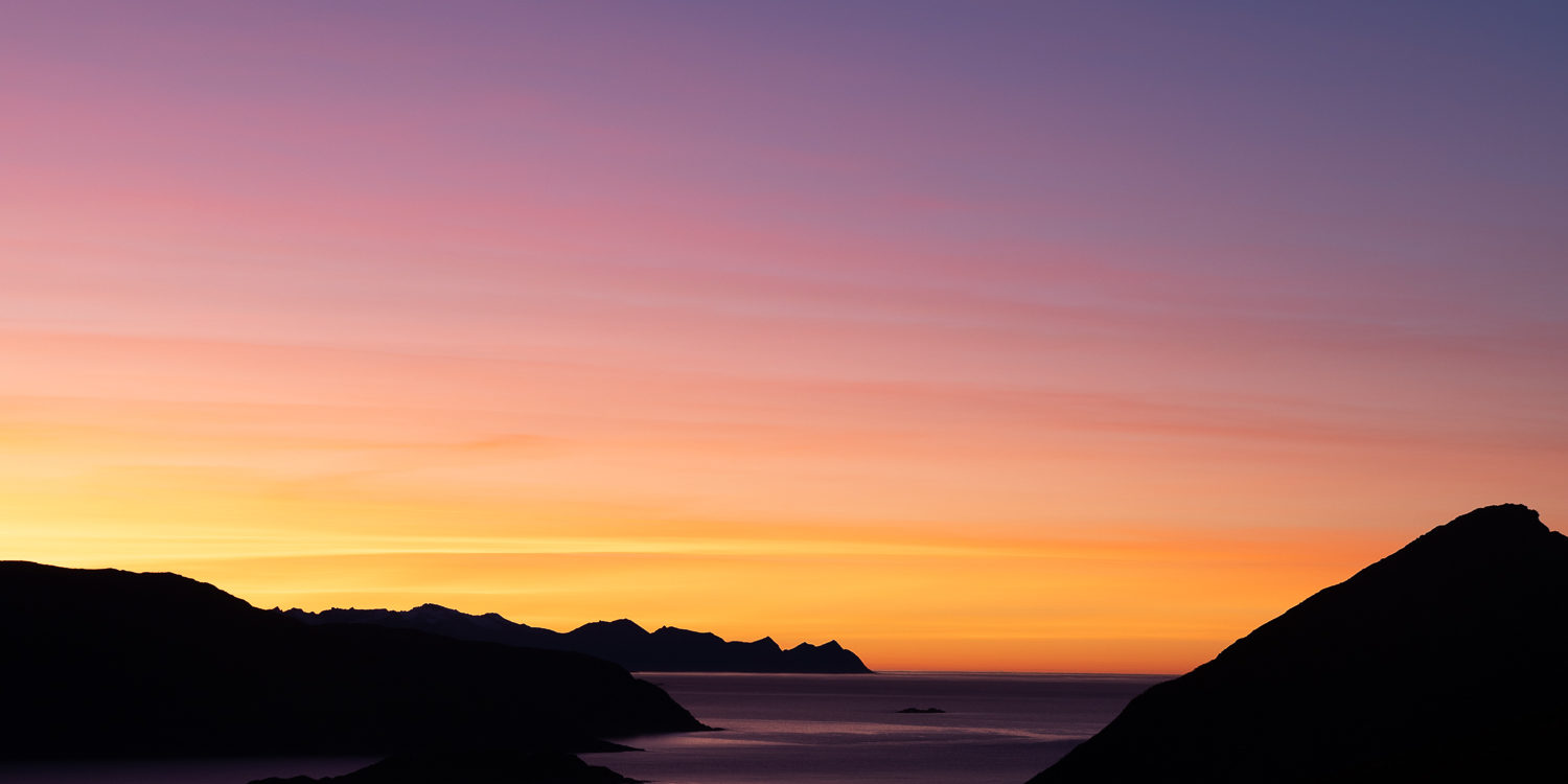 À cette époque de l’année, le soleil ne sort que pour quelques heures et flirte avec les montagnes. Il distille au long de sa courte course une lumière très chaude et rasante, propice à la photographie. Les majestueux paysages du Balsfjord et de Lyngen ou des îles de Senja et de Kvaløya sont magnifiés par ces ambiances lumineuses irréelles, typiques des hautes latitudes. À l’orée de la nuit polaire, ce n’est pas l’absence de lumière qui nous marque, mais bien ce festival d’aubes rose-violette et de crépuscules orange-mauve qui n’en finit plus. Nous avons l’impression d’évoluer dans un tableau, dans un autre monde, un temps suspendu entre ciel et terre.