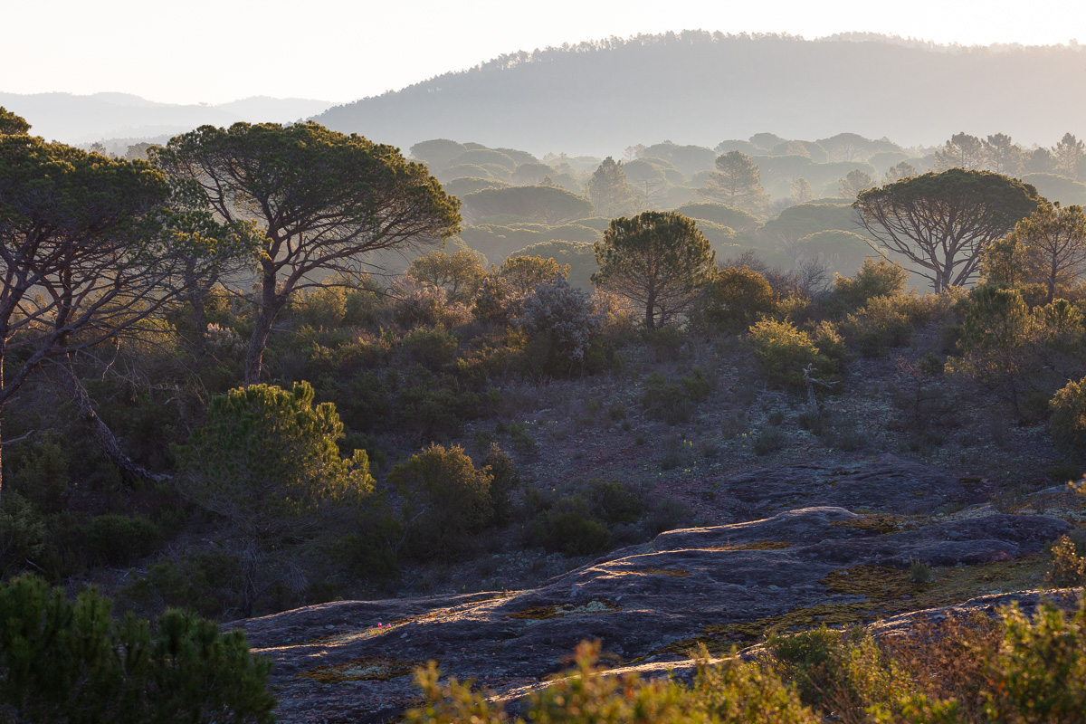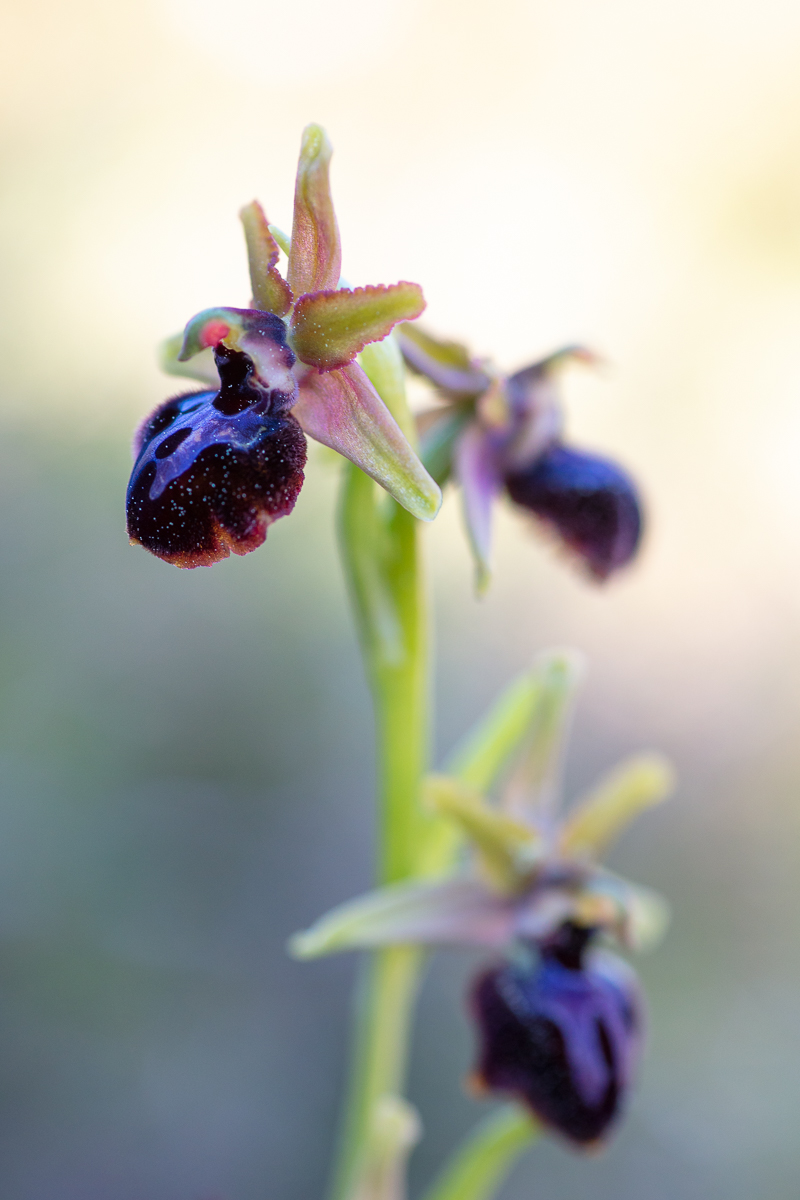 Paradis des amoureux de la nature, classée depuis 2009, la réserve naturelle nationale de la Plaine des Maures est un ensemble unique d’écosystèmes méditerranéens et abrite donc une faune et une flore bien spécifiques. La géologie particulière, faite d’affleurement de grès rouge du Permien, offre un sol légèrement acide globalement drainant et sableux, mais chaque cuvette retient l’eau des pluies, formant des mini-oasis temporaires. C’est le domaine de la tortue d’Hermann et du lézard ocellé, espèces emblématiques de la réserve, que je n’aurai pas l’occasion d’observer hélas. Dans les zones de prairies, des tapis de délicates anémones déroulent des camaïeux de violets, tandis que dans les boisements de pins parasols, les iris nains rivalisent d’exubérance, passant du jaune pâle au violet presque noir. Quelques tulipes australes amorcent leurs floraisons… Mon objectif principal est ici de photographier une orchidée typique de ces lieux : Serapias neglecta. J’avoue une fascination pour ce genre dont le nom vernaculaire est « orchidée langue », à cause de la forme évocatrice du labelle. Des huit espèces présentes en France, aucune ne pousse dans mon secteur en Savoie, cette relative rareté confère à mes yeux une dimension peut-être mythique et irréelle?