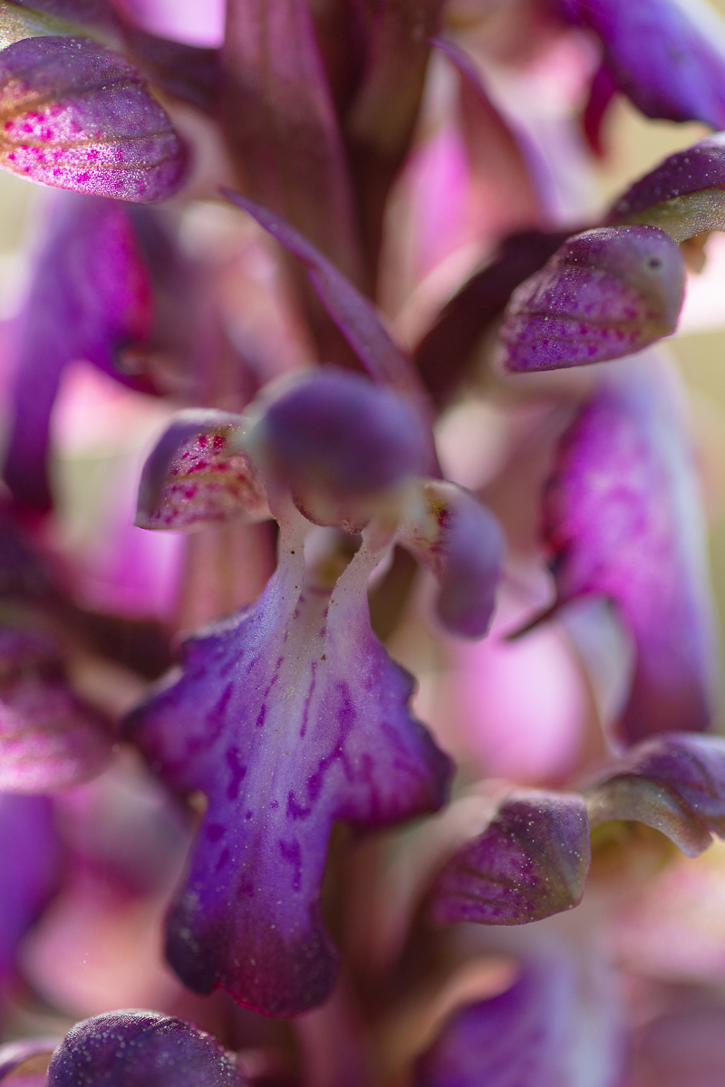 Cap plein nord sur l’A7. Je sors à Valence et quitte provisoirement la route des Alpes. Je trouve facilement le point indiqué et là quel ravissement : une quinzaine de pieds d’Anacamptis papilionacea ! Cette orchidée est normalement bien plus méditerranéenne, elle est par exemple assez commune en Sardaigne. Je suis donc très heureux de la savoir installée dans la Drôme. Décidément, ce département est d’une richesse extraordinaire au niveau des orchidées. Le vent souffle, je mitraille donc pour assurer, sachant que je photographie avec une grande ouverture (en général entre f4 et f5,6, parfois un peu plus, avec un objectif 90mm macro Tamron) pour obtenir peu de profondeur de champ et un joli flou. Du coup, je n’ai pas droit à l’erreur, les 2 ou 3 mm de zone de netteté doivent être là où je le veux. Alors je multiplie les photos, sachant de toute façon que mon périple se termine ici. Tant que je suis dans la technique photo, vous aurez peut-être remarqué que j’essaye autant que possible d’avoir une lumière douce, diffuse sur les fleurs, afin de restituer au mieux le modelé, les formes et les couleurs. Dans ce but, je place mes fleurs dans l’ombre, le plus souvent à l’aide d’une feuille de papier calque, parfois avec ma propre ombre. Et comme j’expose pour la fleur, il en résulte une sur-exposition, parfois jusqu’à +2 IL (voir plus), de l’arrière plan. Avec cette technique, je peux photographier même en milieu de journée, aux heures de lumière dure, que j’ai plutôt tendance à fuir le reste du temps. C’est l’avantage de la macrophotographie : comme on travaille sur de petits sujets, il devient possible de modeler un peu la lumière. Si vous souhaitez approfondir ces techniques photo, n’hésitez pas à vous joindre à l’un de nos stages sur la thématique macro.