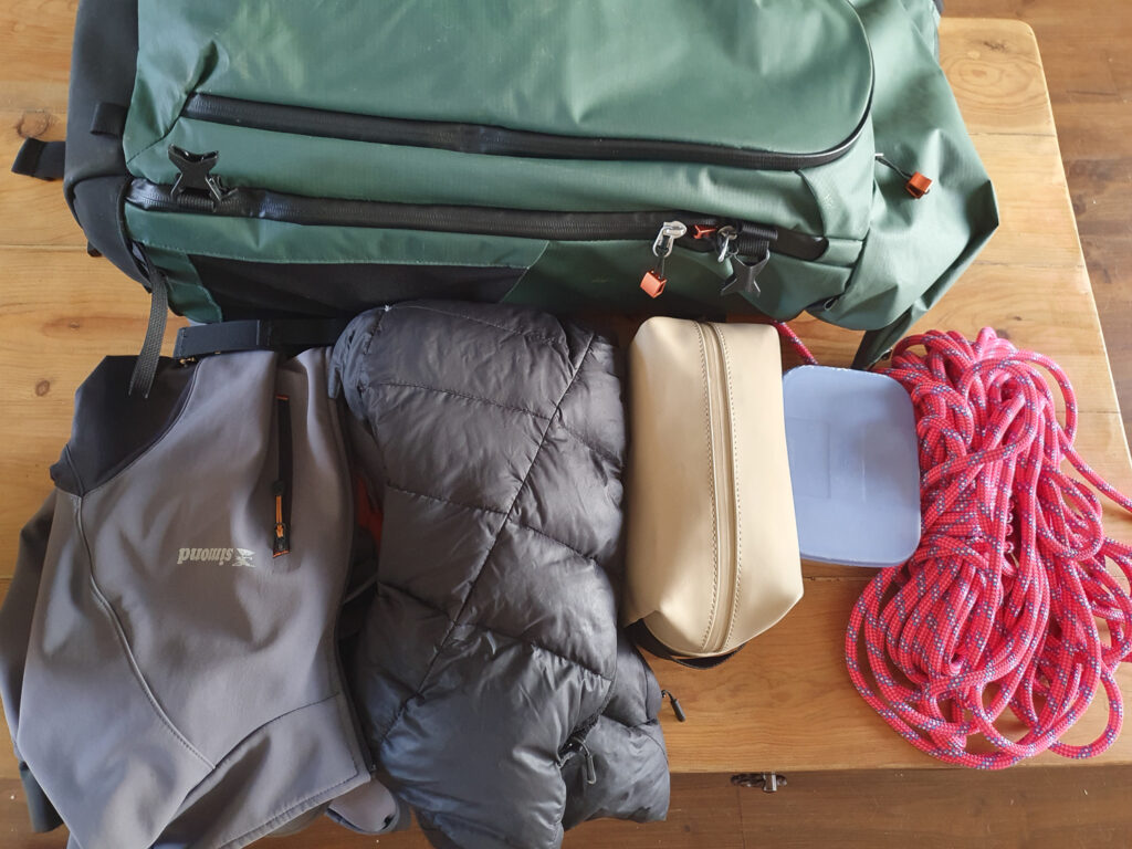 Bonne surprise, l’espace restant permet de loger le nécessaire pour une rando en montagne avec des clients : une trousse de secours, une corde en cas de besoin, une veste et une petite doudoune, et bien sûr un pique-nique. Quant à mon thermos pour la journée, il sera à l’abri du froid dans la grande poche dorsale. Par des températures plus clémentes, des poches externes latérales peuvent accueillir une bouteille d’un litre sans problème, et bien entendu un trépied. Parfait pour le volume !