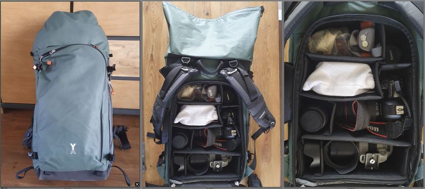 L’insert taille médium se révèlera d’un cheveu trop étroit pour loger un boitier reflex, deux objectifs trans-standards et un télé 100-400mm. L’insert de taille L est largement suffisant pour loger en plus ma boite de filtres, un 50mm et le nécessaire de nettoyage (un second boitier rentrerait sans souci).