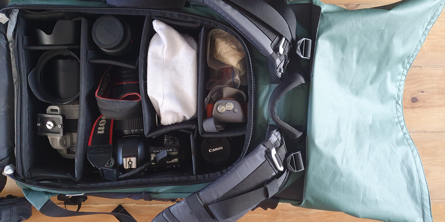 L’insert taille médium se révèlera d’un cheveu trop étroit pour loger un boitier reflex, deux objectifs trans-standards et un télé 100-400mm. L’insert de taille L est largement suffisant pour loger en plus ma boite de filtres, un 50mm et le nécessaire de nettoyage (un second boitier rentrerait sans souci).
